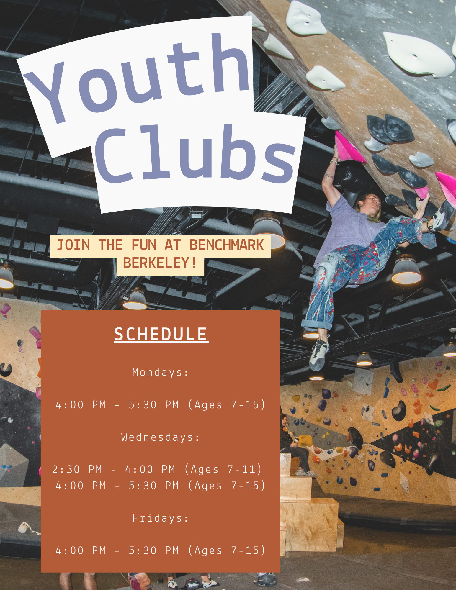 Welcome to the Youth Climbing Club at Benchmark Berkeley! This is a club for younger climbers who are excited about improving their skills through structured practice but are not currently interested in joining a competitive team. The main focus of this club is to help climbers develop a love for the sport while honing their technique, introducing healthy team dynamics, and helping them become well-rounded climbers. This program provides a great opportunity to train with other young climbers in a relaxed, non-competitive social environment, while preparing them for more advanced climbing in the future.